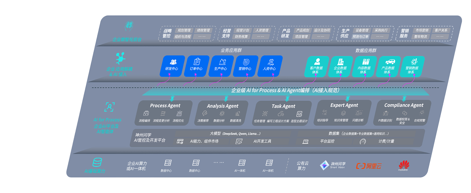 端到端的一站式AI工作空间深度融合了从企业战略规划到日常经营的全流程业务板块,,定向解决车企内部领域多、、、部门多、、链条长、、、场景碎片化等难题,,支持车企快速构建以AI为核心的生产力写作体系,,,,实现任务执行与AI能力的无缝集成与交互